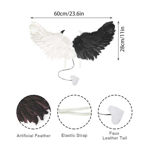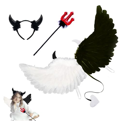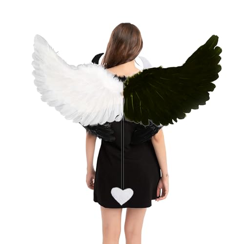 Ali d'angelo, ali con aureola e bacchetta, costume angelo Bianco Nero donna, costume angelo Bianco Nero, ali d'angelo per bambini adulti Halloween Carnevale Masquerade Fancy Dress Party Cosplay