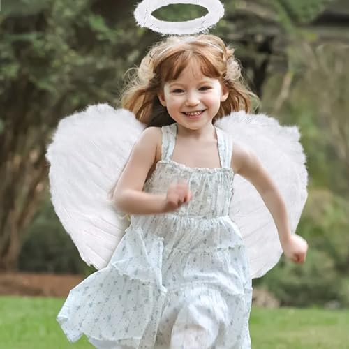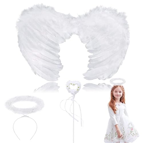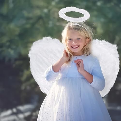 Ali Angelo Piumate,Ali Angelo Bianche,Ali d Angelo Costume da Angelo,Ali d Angelo Decorative con Aureola e Bacchetta,Ali da Angelo Ragazze Costume per Halloween Carnevale Cosplay (Bianco)