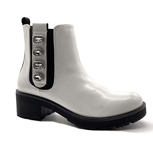 ANGKORLY - Scarpe Moda Stivaletti Scarponcini Stivali - Scarponi Chelsea Boots Biker - Moto Biker Donna Verniciato Strass Diamante Bicolore Tacco Blocco 4.5 CM - Bianco L468 T 39