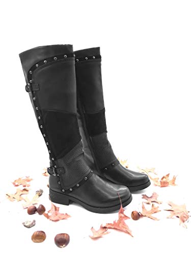 ANGKORLY - Scarpe Moda Stivali Alti Ginocchio Stivali - Scarponi Biker bi-Materiale Classic Donna Tanga Fibbia Borchiati Tacco a Blocco 3.5 CM Foderato di Pelliccia