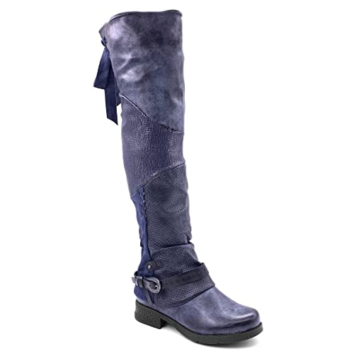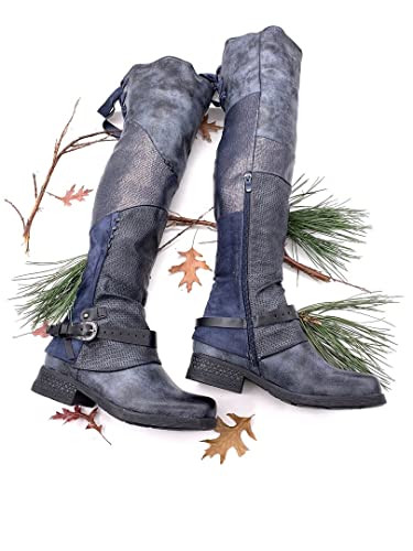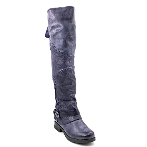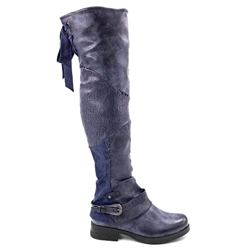 ANGKORLY - Scarpe Moda Stivali Alti Ginocchio Stivali - Scarponi Biker Flessibile Coperta Donna Tanga Fibbia Nodo Tacco Blocco 3.5 CM Leggermente Foderato di Pelliccia - Blu Grigio F81 T 36