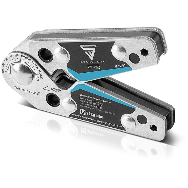 Magnete per saldatura STAHLWERK M-22 ST - 22kg / 48lbs - angoli regolabili in modo flessibile 20° - 200°. Magnete per saldatura STAHLWERK/angolo di saldatura 48 lbs / 22 kg, angoli regolabili in modo flessibile in una gamma da 20° a 200°. Caratteristiche Ausilio ideale per tutti i fabbri, i saldatori e gli artigiani. Adatto, tra l'altro, alle seguenti applicazioni: Saldatura, taglio al plasma, saldatura, installazione, regolazione ecc. Adatta a molti tipi di saldatura come TIG/MIG/MAG/ARC/MMA Forte e preciso: forza di tenuta di 22 kg e angoli regolabili in continuo da 20° a 200°. Compatto, robusto e leggero Sostituisce una terza mano in molti casi Utilizzare i magneti solo per l'imbastitura o la saldatura a punti. Lo stress termico può danneggiare i magneti. Rimuovere i magneti prima di iniziare a saldare. Contenuto della fornitura 1 x magnete STAHLWERK 48 lbs/ 22 kg 20°-200° 1 x chiave a brugola
