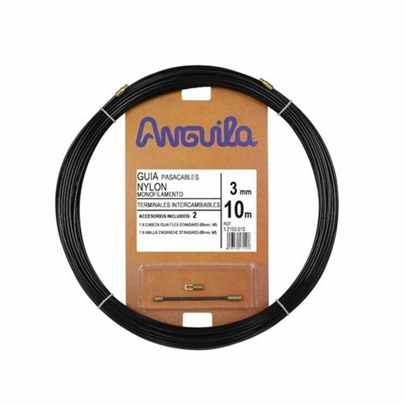 Passacavo in Nylon monofilamento Ø 3 mm e lungo 10 metri, colore nero, provvisto di terminali intercambiabili, testa guida flessibile Ø 6 mm e anello di trazione fisso Ø 6 mm. Il nylon è il materiale con il maggior effetto memory, per questo ha più punti di attrito, acquisendo un originale movimento a spirale, per questo esercita meno forza di spinta, e il suo utilizzo è sconsigliato a distanze superiori a 20 o 25 metri.
