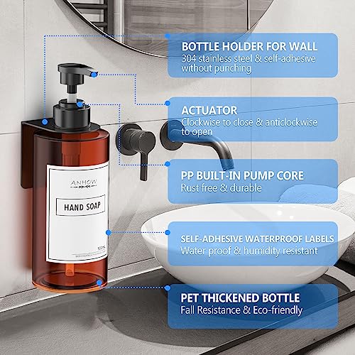Anhow 4 Pezzi Dispenser Sapone Bagno, 500ml Dispenser Sapone Muro Dispenser di Liquido per Bagno Doccia Cucina Shampoo Balsamo Bagnoschiuma - Marrone