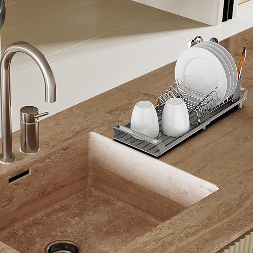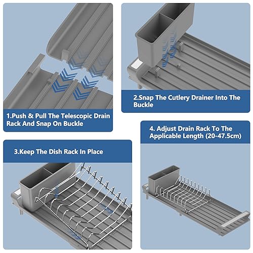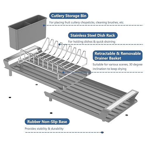 Anhow Scolapiatti da Appoggio, Scolapiatti con Cestello per Posate Scolapiatti Pieghevole Scola Piatti Estensibile in Inossidabile Plastica Materiale - Grigio