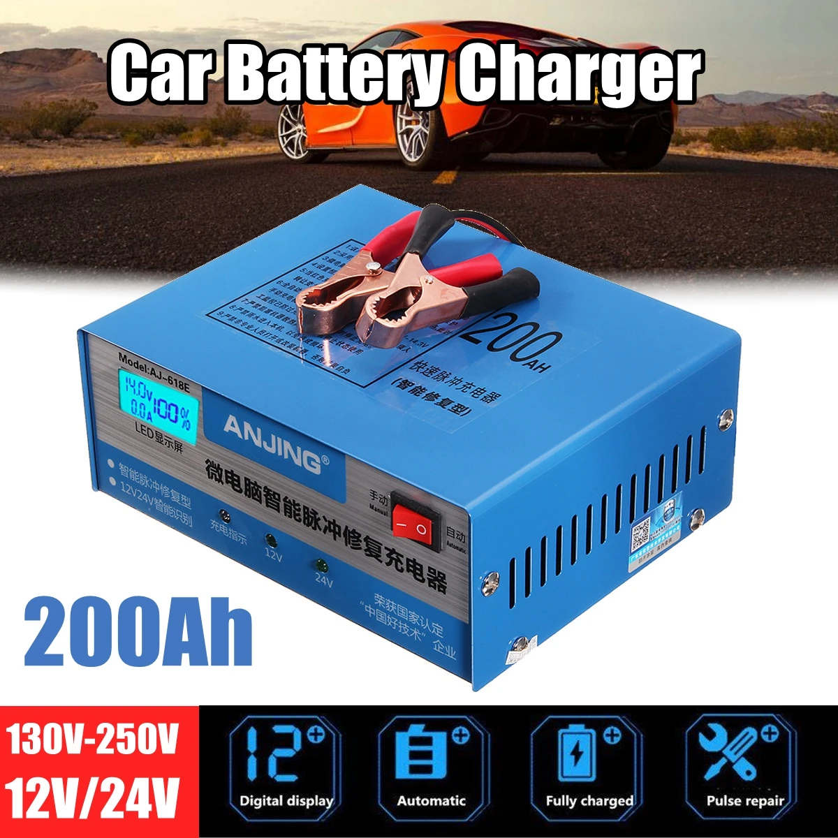 ANJING AJ-618E Car Battery Charger Automatic Intelligent Pulse Repair 130V-250V 200AH 12/24V With Adapter Jump Starter