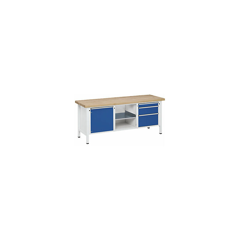 Banco da lavoro, struttura modulare, 1 anta da 540 mm, 3 cassetti, faggio massello, estrazione totale. Fornitura = montato. Larghezza piano = 2000 mm. Profondità piano = 700 mm. Tipo di piano = piano in faggio massello. Spessore piano = 40 mm. Numero cassetti = 3 pz. Altezza cassetti = 1x90, 1x180, 1x270 mm. Altezza = 840 mm. Altezza di lavoro = 840 mm. Colore corpo = grigio chiaro RAL 7035. Colore frontalino = blu genziana RAL 5010. Versione cassetti = guida a rulli. Portata per cassetto = 100 kg. Estrazione cassetti = 100%. Materiale telaio = acciaio, verniciato a polvere. Numero ante = 1 pz. Altezza porta = 540 mm. Portata statica = 1500 kg. Versione telaio = tubo a sezione quadra 45x45 mm. Colore telaio = grigio chiaro RAL 7035. Serratura = chiusura centralizzata a cilindro con nucleo sostituibile. Numero ripiani = 1 pz. Larghezza x profondità 2000 x 700 mm. Maniglia in alluminio con targhette. Massima stabilità - componenti del corpo ribattuti fino a 10 volte. Resistente piano di