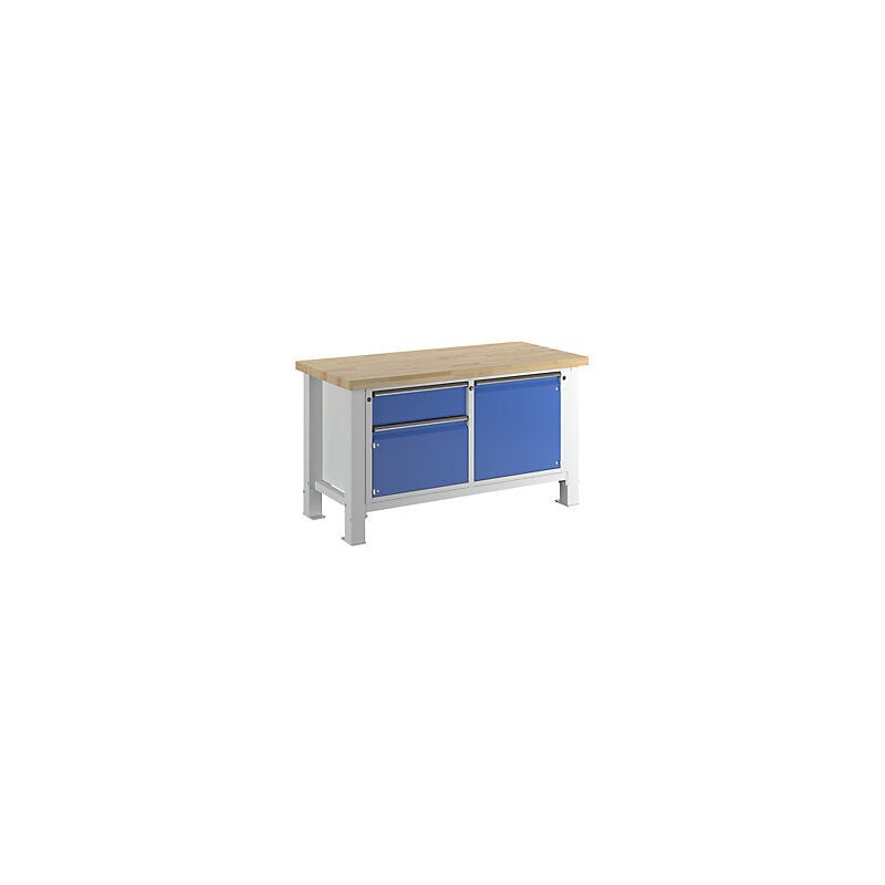 Banco da lavoro per carichi pesanti, larghezza piano 1500 mm, 1 cassetto, 2 ante a battente, spessore piano 50 mm. Fornitura = montato. Larghezza piano = 1500 mm. Profondità piano = 700 mm. Tipo di piano = piano in faggio massello. Spessore piano = 50 mm. Numero cassetti = 1 pz. Altezza cassetti = 1x180 mm. Altezza di lavoro = 850 mm. Colore corpo = grigio chiaro RAL 7035. Colore frontalino = blu genziana RAL 5010. Versione cassetti = guida a rulli. Portata per cassetto = 100 kg. Estrazione cassetti = 86%. Materiale telaio = acciaio, verniciato a polvere. Numero ante = 2 pz. Altezza porta = 1x360, 1x540 mm. Portata statica = 2000 kg. Versione telaio = tubo a sezione quadrata, 80x80x3 mm. Colore telaio = grigio chiaro RAL 7035. Serratura = chiusura centralizzata a cilindro con nucleo sostituibile. Portata fino a 4 tonnellate a seconda della versione. Massima stabilità - componenti del corpo ribattuti fino a 10 volte. Resistente piano di lavoro in listelli di faggio a incastri incollati