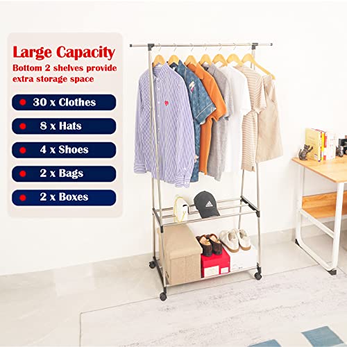 Anmerl Appendiabiti - Appendiabiti Mobile con Ruote Bloccabili e 2 Ripiani Aggiuntivi per la Conservazione - Versatile Supporto per l'Armadio, Camera da Letto, Lavanderia e Ufficio
