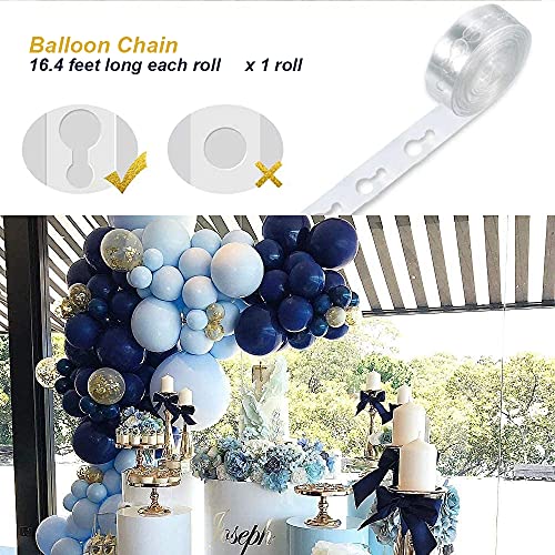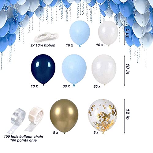 【Palloncino Kit Ghirlanda Azzurri】Il kit arco palloncino blu oro include: 40 palloncini in lattice azzurri (10 pollici, 5 pollici), 30 palloncini bianchi (10 pollici, 5 pollici), 10 palloncini blu navy (10 pollici), 5 palloncini dorati metallici (12 pollici), 5 palloncini con paillettes in metallo (12 pollici), 2 rotoli di nastro da 10 m, 1 rotolo di nastro adesivo puntinato, 1 rotolo di catena a palloncino.