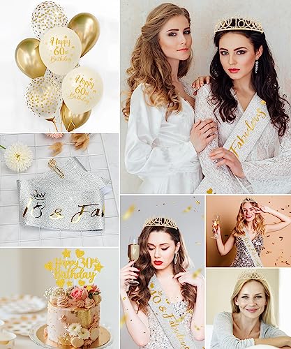 60 Anni Compleanno Donne, Fusciacca e Diadema per il 60 ° Compleanno Corona Tiara Decorazioni Compleanno 60 Anni Happy Birthday Cake Topper Palloncini Beige Dorati per Decorazioni Compleanno Donne