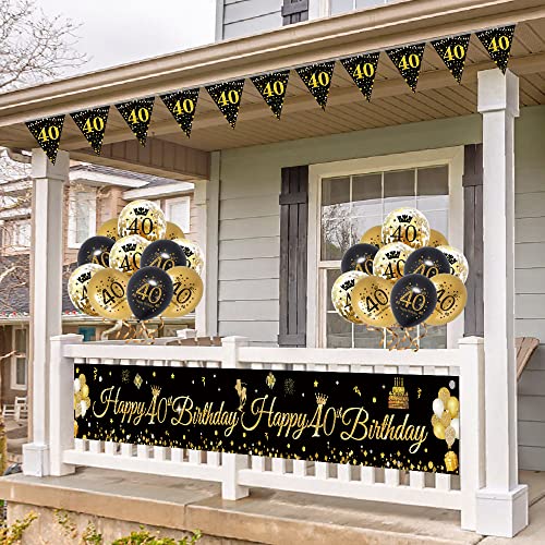 40 ANNI DECORAZIONI COMPLEANNO: Riceverai 1 striscione extra large nero e oro per il 40° compleanno (dimensioni: 9 * 1,2 piedi), 1 stamina triangolare stampata su entrambi i lati con 11 bandiere (misura 7,4 x 10,8 pollici ogni bandiera), e palloncini stampati 15 pezzi (5 palloncini oro metallizzato, 5 palloncini neri, 5 palloncini coriandoli oro).