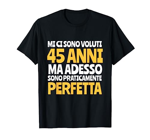 Scritta Sarcastica e divertente: Ci sono voluti 45 anni ma adesso sono praticamente perfetta. Ottimo idea regalo di compleanno ragazza e donna per i quarantacinque anni di una sorella, figlia, cugina, nipote o amica per festeggiare con allegria e ironia.