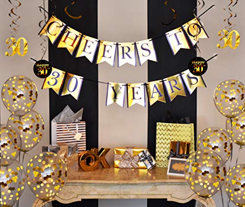 CONFEZIONE: La confezione include uno striscione "Cheers to 30 Years", 12 Palloncini glitter dorati, 7 vortici in oro e argento "30" e 100 coriandoli in oro "30"