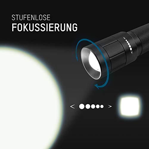 CONSEGNA: 1x torcia LED focalizzabile con 14200 lx e 1500 lm / 6x batterie alcaline Mignon AA / 1x cinghia da polso / manuale di istruzioni