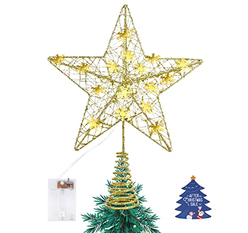 Puntale scintillante per albero di Natale: il puntale per albero è rivestito con polvere dorata e paillettes a fiocco di neve, e ha 22 luci LED bianche calde e con funzione lampeggiante. Mostra un effetto visivo scintillante, crea un'atmosfera natalizia calda e felice, rende l'albero di Natale unico e sorprendente.