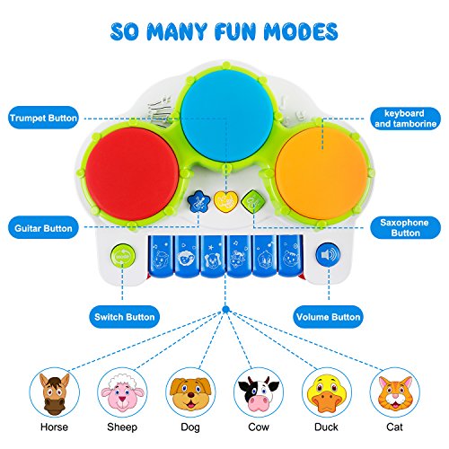 4 MODALITÀ DI DIVERTIMENTO: il giocattolo per l'apprendimento musicale ha 4 modalità tra cui scegliere. Ogni modalità ha il proprio set di suoni e strumenti che possono essere riprodotti premendo i tasti del pianoforte e i pulsanti colorati in alto. Ascolta i suoni di chitarra, tromba, sassofono, tastiera e tamburello, insieme al suono di simpatici animali selvaggi della giungla. Inoltre, il pulsante blu ti consente di controllare facilmente il volume del giocattolo musicale.