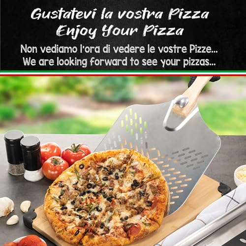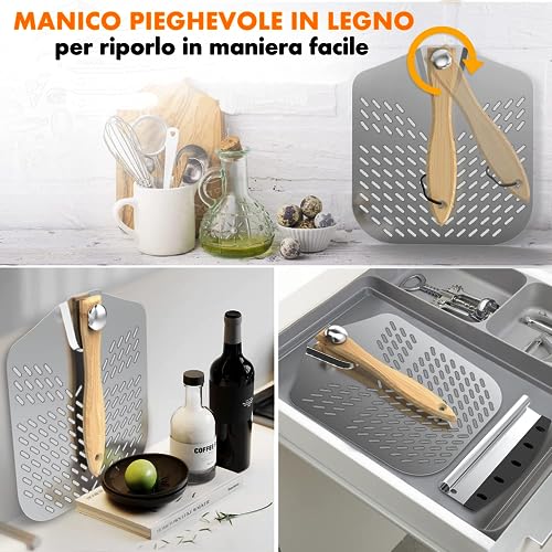 [PALA PER PIZZA PROFESSIONALE] La pala per pizza forata ha una superficie ampia di 30,5 x 35,5 cm, con il manico staccabile o ripiegabile di 25 cm. Ciò consente di sfornare facilmente pizze piccole e grandi. La pala pizza forata è realizzata in alluminio lucido di alta qualità. Il materiale è estremamente solido ma anche sottile, offrendo una perfetta stabilità