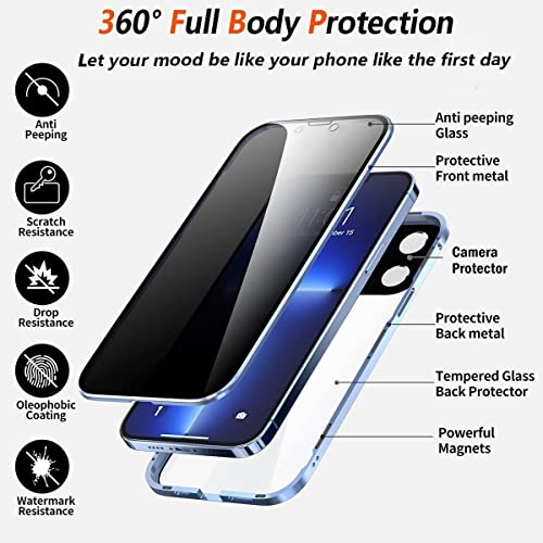 Anti Peep Custodia Compatibile con iPhone 14, Adsorbimento Magnetica Anti-Spia Cover 360 Gradi Protezione Privacy Vetro Temperato Anti-Peeping Custodia Metal Bumper Case Cover,Blu