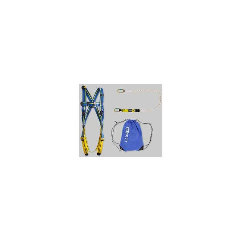 Kit anticaduta certificato per poter dissipare la forza d'impatto di una caduta. Il kit comprende: 1 Imbracatura Light Plus 2, 2 moschettoni 981, 1 assorbitore di energia con corda 361, 1 borsa tra trasporto. Portata massima 140Kg. Peso 1,6Kg. Conferma alla normativa EN361,EN362,EN355.