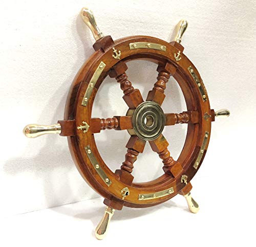 ANTIQUE Ruota della nave in legno massello 40,5 cm di ancoraggio e strisce con maniglie in ottone decorazione da parete