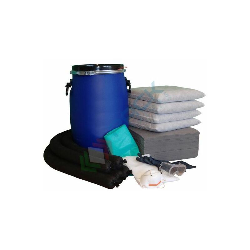 Kit di pronto intervento linea cantieristica, confezionato in fusto di plastica Mis. Ø 400 x 620 H mm. Kit antisversmento ideale per assorbire la maggior parte dei liquidi presenti nei cantieri, liquidi industriali, liquidi organici ed inorganici, idrocarburi, solventi, antigelo, acidi, basici ecc.. Pratico kit assorbente con capacità assorbente di 77 Litri, ideale per essere portato velocemente e facilmente sul luogo dell'incidente nel cantiere. Il kit antisversamento per cantiere contiene 30 fogli assorbenti universali grigi Mis. 50 x 40 cm (Art. FGL-UN05040/S), 4 manicotti assorbenti universali grigi Mis. Ø 8 x 120 cm (Art. MAN-UN80120), 2 cuscini assorbenti universali grigi Mis. 40 x 20 cm (Art. CUS-UN4020), 1 sacco da 7 kg di granuli assorbenti fini, 1 paio di guanti, 1 mascherina filtrante, 1 occhiale di sicurezza, 1 sacco per lo smaltimento dei rifiuti. Le recenti normative ambientali (come le procedure Iso 14000, ADR, D.M. 20/2011, ecc.) dispongono adempimenti in merito alla