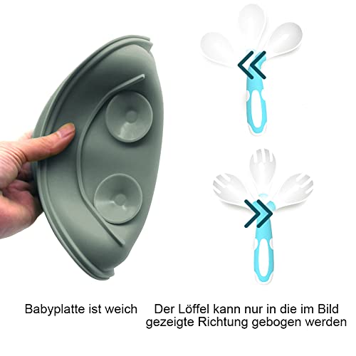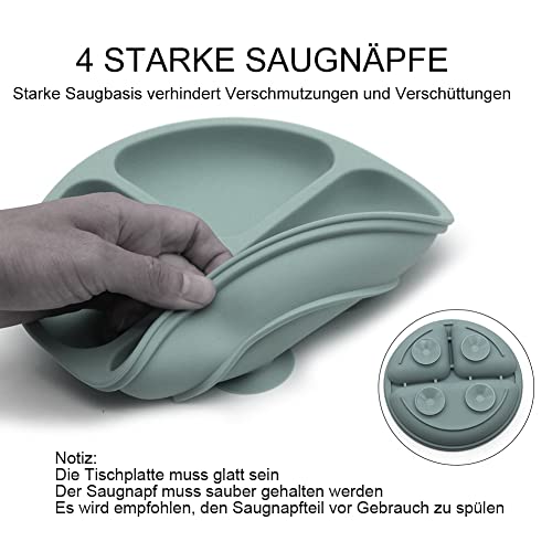 ANTUREBAY Piatto per bambini con ventosa, piatto in silicone per bambini con cucchiaio, forchetta, piatto antiscivolo, per bambini e bambini in silicone, con scomparti (rosa grigio)