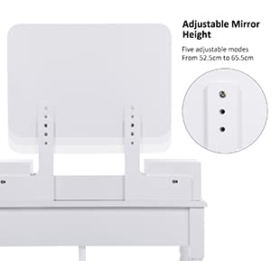 Grande specchio senza cornice e cinque altezza regolabile: il grande specchio senza cornice di questo tavolo da trucco offre uno sguardo chiaro al tuo riflesso in modo da poter avere capelli e trucco impeccabili ogni giorno. È inoltre possibile regolare l'altezza dello specchio da 52,5 cm a 65,5 cm per soddisfare le vostre esigenze.
