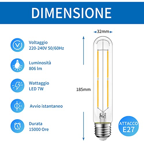 ANWIO Lampadine LED Filamento Attacco E27 - 7W Equivalenti a 60W,806 Lumen,Luce Bianca Calda 2700K,Forma T32,Stile Vintage Retro',Non Dimmerabile - Confezione da 4 Pezzi