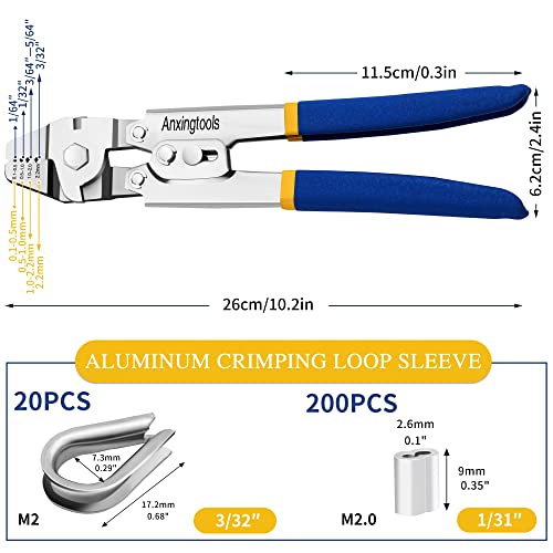 【Cosa ottieni】 Riceverai 1 strumento di crimpatura per funi metalliche, 200 pezzi di manicotti per aggraffatura in alluminio, 20 ditali in acciaio inossidabile