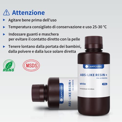 ANYCUBIC Resina ABS-Like Plus per Stampante 3D con Eccellente Durezza e Tenacità, Alta Precisione Resina UV 405nm a Polimerizzazione Rapida per Stampa 3D LCD/DLP/SLA, Bianco 500G
