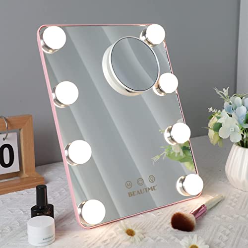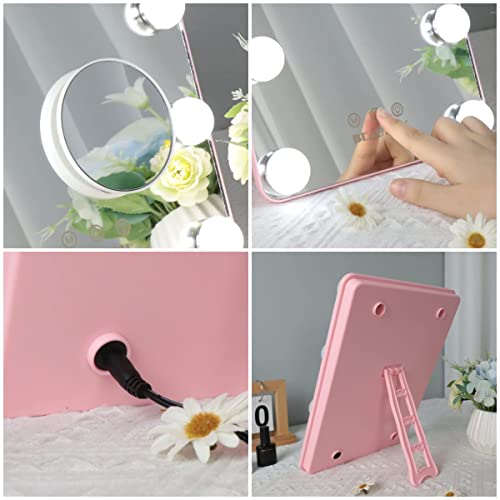 ANYHI Hollywood - Specchio da trucco con luci, grande specchio illuminato, con ingrandimento 10X e luce a 3 colori, specchio da tavolo con luce, 22,9 x 30,5 cm, rosa