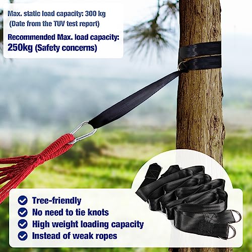 Sistema di Sospensione: Viene fornito con cinghie in nylon ad alta densità rispettose degli alberi e 2 moschettoni, che rendono facile montare e smontare l'amaca senza danneggiare gli alberi. Questo tipo di sistema di sospensione ti offre maggiore comfort e sicurezza dell'amaca ed è abbastanza resistente da sostenere il peso dell'amaca e dei suoi occupanti.