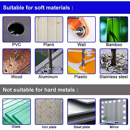 ➣ Ampia applicazione - La punta da trapano ha un ampio raggio di utilizzo, ideale per la maggior parte dei lavori di perforazione. Particolarmente adatto per la lavorazione di materiali morbidi come lastre di ferro, rame e alluminio, legno, gomma, plastica, bambù, ecc. (Nota: non per metallo duro)