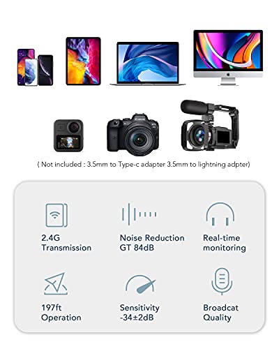 Kit microfono wireless: include 1 trasmettitore (collegato al lavalier) e 1 ricevitore (collegato al dispositivo), con la trasmissione wireless a 2,4 GHz, è possibile ottenere la registrazione in tempo reale da remoto, con una distanza fino a 200 piedi ( 60m)