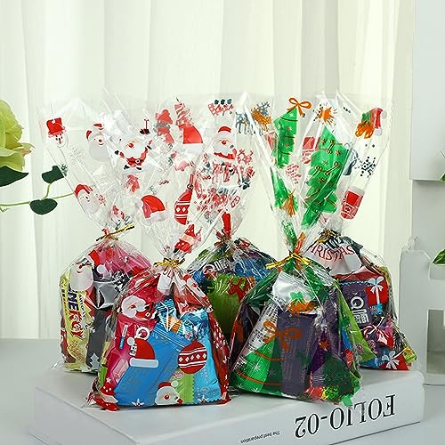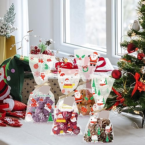 AOKITO 150pcs Sacchetti Trasparenti Natalizi per Biscotti, Sacchetti Trasparenti per Confezioni, Sacchetti Caramelle Natale con 180pcs Cravatte per Caramelle, Biscotti, Cioccolatini, Regalo (6 Stili)
