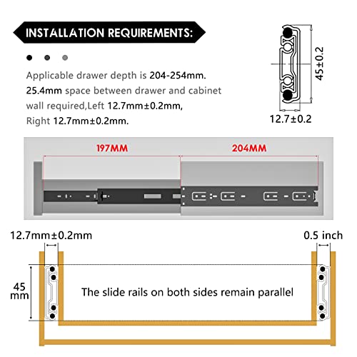 Guida all'installazione: lunghezza: 203,2 mm, lunghezza di estensione completa: 406,4 mm, adatto per cassetti con profondità interna ≥ 20,3 - 25,4 cm. Distanza montaggio lato sinistro: 0,5" (12,7 mm), distanza montaggio lato destro: 0,5" (12,7 mm). Ci sono 8 viti nella scatola di carta su entrambe le estremità del prodotto. Si prega di spingere prima il cuscinetto a sfera interno alla parte superiore della guida di scorrimento, quindi collegarlo con la guida di scorrimento. Ci sono istruzioni di installazione elettronica nella parte inferiore del link.