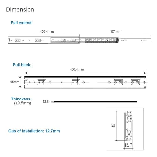 Estensione completa: lunghezza: 406,4 mm, lunghezza di estensione completa: 812,8 mm, adatto per cassetti con profondità interna ≥ 40,6 - 45,7 cm. Distanza montaggio lato sinistro: 0,5" (12,7 mm), distanza montaggio lato destro: 0,5" (12,7 mm). Ci sono 8 viti nella scatola di carta su entrambe le estremità del prodotto. Si prega di spingere prima il cuscinetto a sfera interno alla parte superiore della guida di scorrimento, quindi collegarlo con la guida di scorrimento. Ci sono istruzioni di installazione elettronica nella parte inferiore del link.