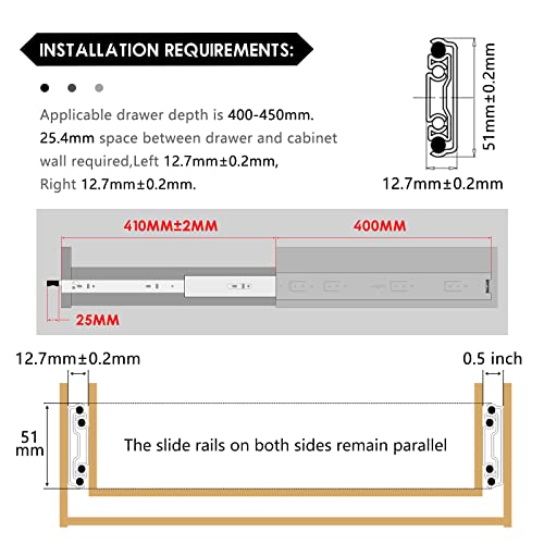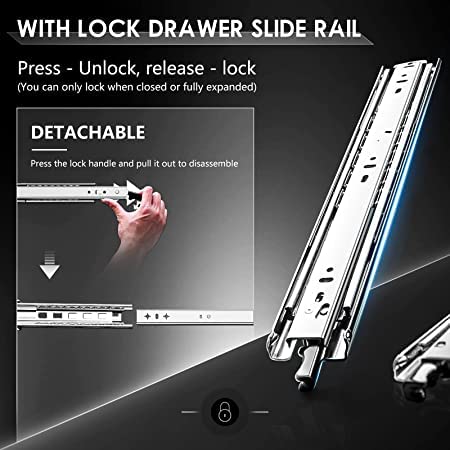 Con serratura per cassetti pesanti. Dimensioni: 400 mm. Spessore di installazione: 0,5"/12,7 mm. Larghezza: 50 mm. Portata: 70 kg. Lunghezza completamente estesa: 32". Contenuto della confezione: 2 guide per cassetti (1 paio di binari) sinistra + destra. i supporti e le viti non sono inclusi nella confezione.