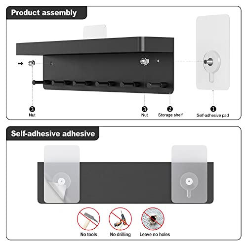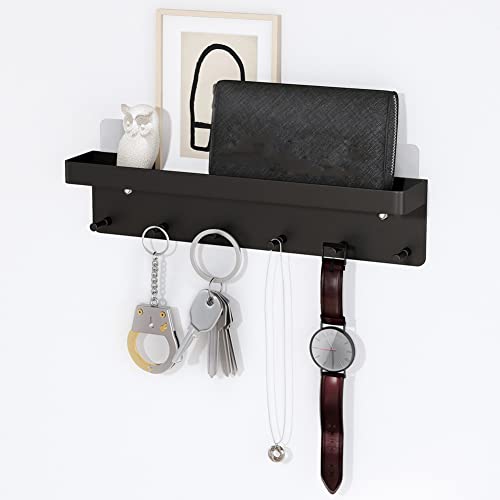 AOSEE Portachiavi da Muro con 6 Ganci, Portachiavi in Acciaio Inossidabile Autoadesivo, Versatile Portachiave e Portalettere con Mensola, Portachiavi di Casa per Ingresso, Cucina e Soggiorno (Nero)