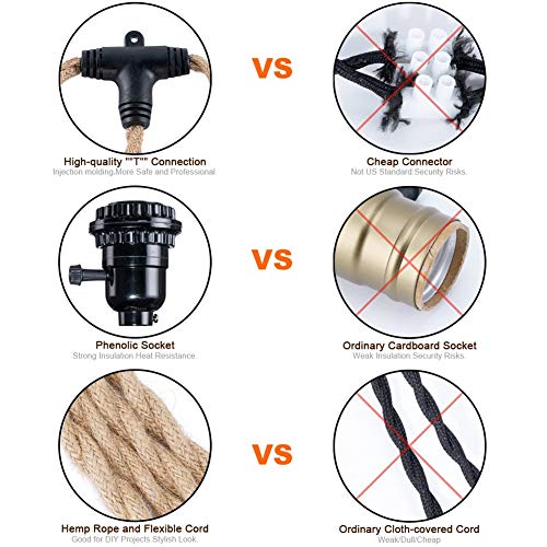 AOSEE Portalampada in Corda di Canapa, Cavo in Tessuto Retrò con Portalampada, Cavo Lampadario in corda di Canapa per E26 / E27, Può Essere Utilizzato in Cucina, Cantina, Soggiorno (18.8FT)