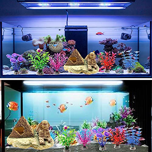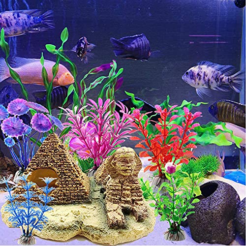 【Incluso】1 pezzi Sfinge piramidale Aquarium Ornament e 5 pezzi assortiti altezze in plastica verde piante acquario: diverse altezze da 5 a 8 cm.
