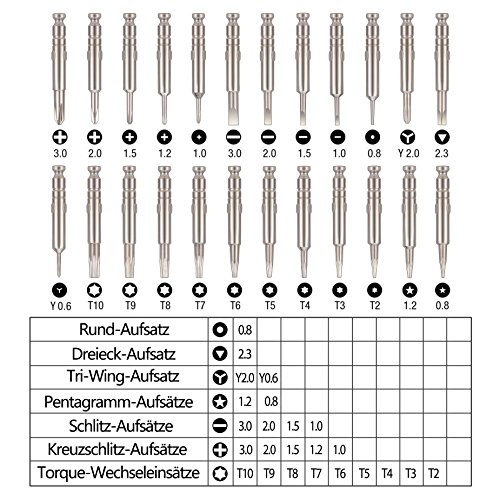 【 Kit perfetto per cellulare e molti altri dispositivi 】 questo speciale fotógrafos attrezzo è ideale anche per la riparazione di PC, notebook e dispositivi elettronici simili. Le 24 diverse magnete Bits consentono l' apertura di quasi tutte le viti speciali, che oggi in laptop, telefoni cellulari, console di gioco e simili dispositivi utilizzati.