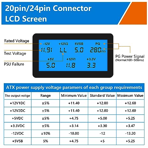 【Display LCD da 1,8 pollici】: la tensione di uscita viene visualizzata sullo schermo LCD da 1,8 pollici, che è facile da leggere (lo schermo LCD da 1,8 pollici è alimentato dal connettore a 20 pin/24 pin) (+/ 0,01 V), allarme automatico di guasto, interfaccia di test completa, aspetto piccolo e bello e più funzioni di test. È la scelta migliore e un aiuto affidabile per rilevare rapidamente l'alimentazione del PC.