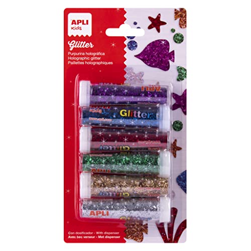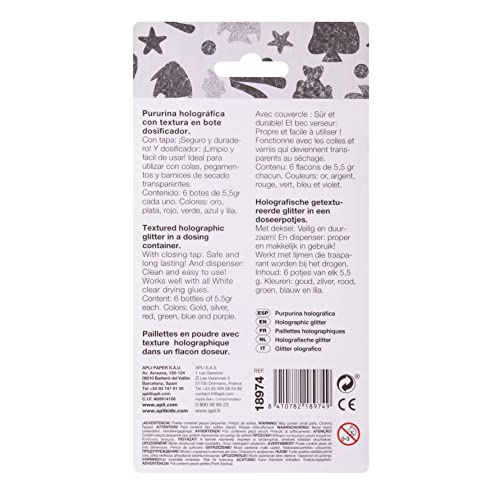 POLVERE glitterata per lavori manuali con finitura olografica in colori assortiti: lilla, blu, rosso, verde, oro e argento. La confezione contiene 6 vasetti, uno per colore, da 5,5 g ciascuno.