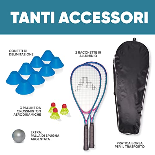 IL SET PERFETTO: il set volano badminton include 2 robuste racchette in alluminio, 3 palline volano giallo fluo e una comoda borsa su misura. Così, con questo set da crossminton, bambini e adulti saranno perfettamente attrezzati per la prossima partita!