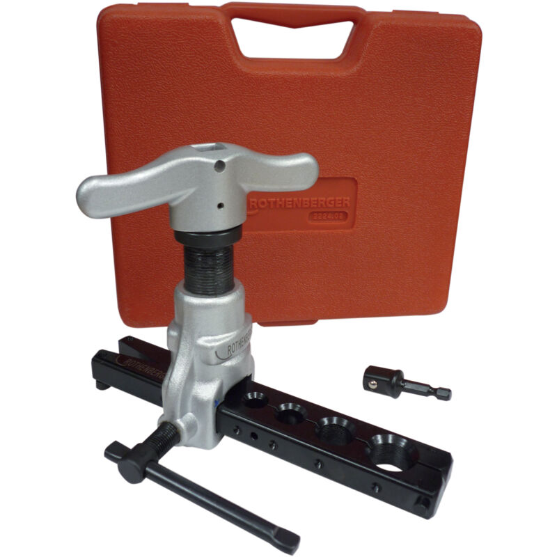 Art. R2224.02 flangiatubi. Modello professionale per tubi in rame. Con cono eccentrico e frizione. Effettua colletti a 90 su tubi in pollici e millimetri. Per realizzare colletti su tubi di rame da 1/8 - 3/4 per applicazioni nei settori della refrigerazione e del condizionamento e linstallazione di unit e split di aria condizionata. Esegue svasature senza deformazioni e crepature. Diametro area di lavoro 3,1 - 19,05 mm. Fornito in cassetta di plastica e con cono autocentrante per un perfetto colletto a 90. Per colletti 4. Peso 700 g.