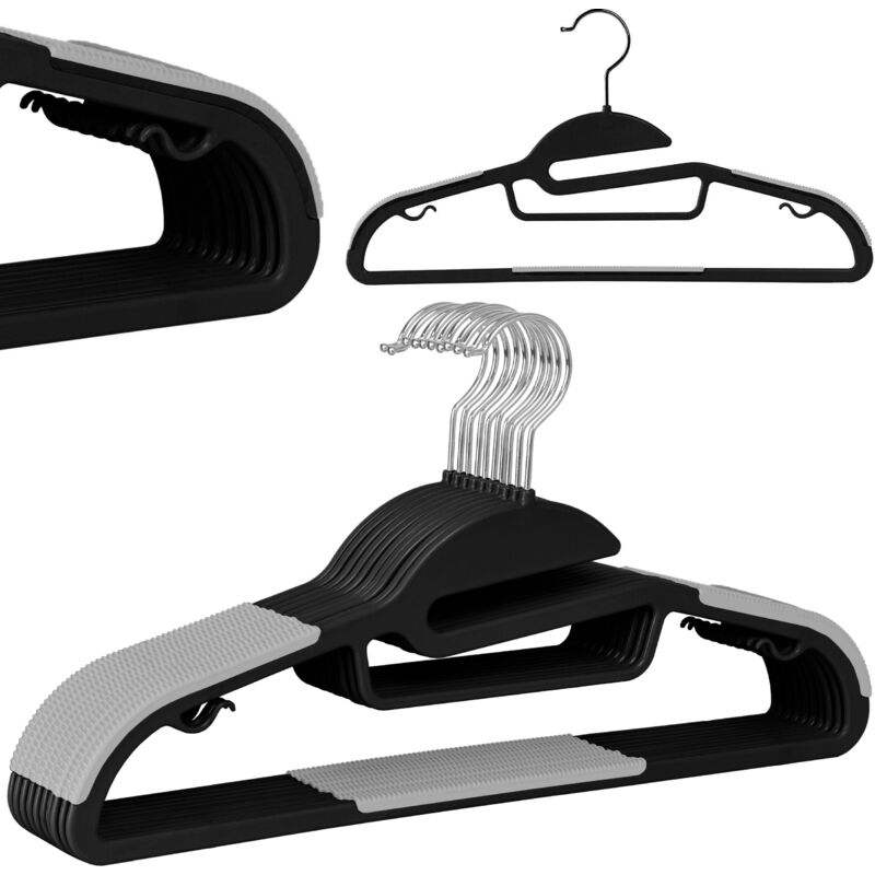 Appendino Flexi, set 10 pezzi, nero e grigio Destinazione d'uso: camerino, boutique | Colori: nero, grigio Offriamo grucce in plastica flessibili e resistenti, perfette per un guardaroba, uno spogliatoio o un'esposizione di vestiti in una boutique. Le grucce sono realizzate in plastica resistente e durevole. Gli elementi in gomma impediscono ai vestiti di scivolare e la sagomatura adeguata impedisce ai tessuti di deformarsi. Le grucce hanno un gancio in metallo cromato. La gruccia è dotata di tacche per facilitare l'indossamento dei vestiti. Grazie a questo, gli indumenti non si allungano né si deformano. Caratteristiche del prodotto: Colore: nero grigio Materiale: plastica, acciaio Gancio ruotabile a 360°: sì Capacità max. carico: 5 kg Dimensioni Larghezza: 41,5 cm Profondità: 0,6 cm Altezza: 22 cm Dimensioni gancio: 8 x 5,4 cm Informazioni aggiuntive I colori mostrati sono solo a scopo illustrativo - potrebbero differire da quelli reali a causa delle diverse impostazioni del monitor