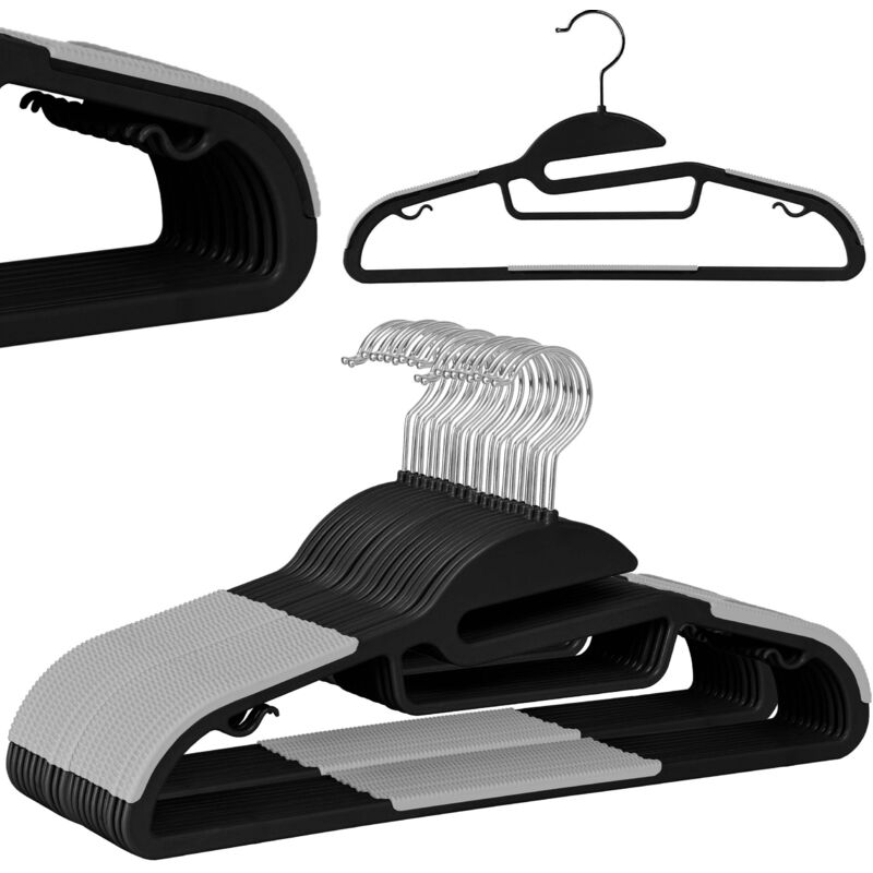 Appendiabiti Flexi, set da 20 pezzi, nero e grigio Destinazione d'uso: camerino, boutique | Colori: nero, grigio Offriamo grucce in plastica flessibili e resistenti, perfette per un guardaroba, uno spogliatoio o un'esposizione di vestiti in una boutique. Le grucce sono realizzate in plastica resistente e durevole. Gli elementi in gomma impediscono ai vestiti di scivolare e la sagomatura adeguata impedisce ai tessuti di deformarsi. Le grucce hanno un gancio in metallo cromato. La gruccia è dotata di tacche per facilitare l'indossamento dei vestiti. Grazie a questo, gli indumenti non si allungano né si deformano. Caratteristiche del prodotto: Colore: nero grigio Materiale: plastica, acciaio Gancio ruotabile a 360°: sì Capacità max. carico: 5 kg Dimensioni Larghezza: 41,5 cm Profondità: 0,6 cm Altezza: 22 cm Dimensioni gancio: 8 x 5,4 cm Informazioni aggiuntive I colori mostrati sono solo a scopo illustrativo - potrebbero differire da quelli reali a causa delle diverse impostazioni del