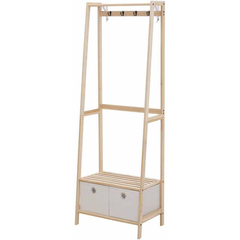 Appendiabiti Appendiabiti per Ingresso 58x36x168 cm in Legno Naturale Tieni cappotti, vestiti e borse in ordine con l'appendiabiti . È dotato di 4 ganci e 3 ripiani, oltre a 2 pratici cassetti in tessuto, che ti permettono di riporre tutto in modo ordinato. L'attaccapanni include un dispositivo antiribaltamento, che assicura una stabilità ottimale. Lo stile rustico con struttura in legno naturale non verniciato porta un tocco originale in ogni ambiente. Sceglilo per l'ingresso, la camera da letto o il soggiorno! UN TOCCO DI NOVITÀ: Questo appendiabiti da terra ha una finitura semplice e dal colore naturale, che porterà praticità e un tocco di novità nei tuoi ambienti. TUTTO IN UNO: Appendi abiti e cappotti e riponi in modo ordinato e discreto tutto ciò che vuoi nei cassetti inferiori. Puoi usarlo come mobile da ingresso, attaccapanni o stender per i tuoi abiti. AMPIO SPAZIO: Lo stand appendiabiti dispone di 3 mensole, 2 cassetti in tessuto e 4 ganci per appendere cappotti, cappelli
